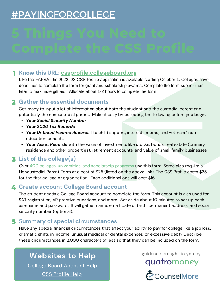 Want to help prepare your students and their families complete the CSS Profile? Distribute this helpsheet to support them as they create their College Board account, understand what documents to gather, know the cost for adding colleges, and anticipate sharing their special circumstances.