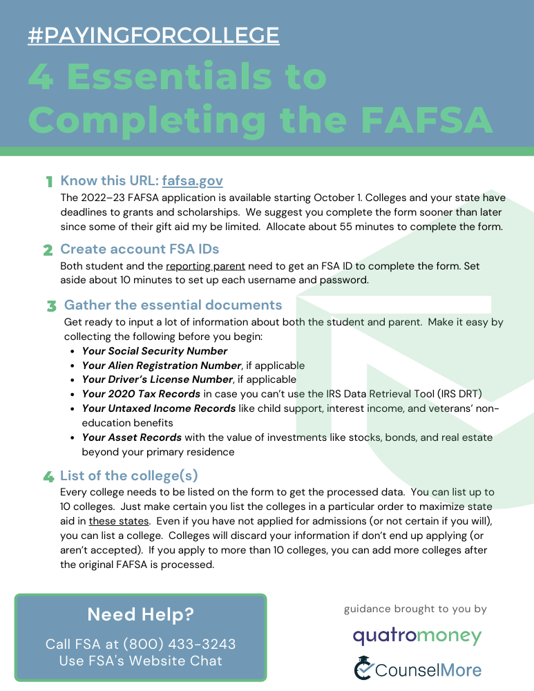 Help your students and their families get prepared to complete the FAFSA will this helpshee. They'll know how to create the FSA ID, what documents to gather to complete the form, and basics on adding their college lists.