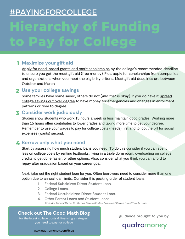 We can't always assume that students and their families know which funding options are better than others. So consider sharing our ranking order of funding sources to pay for college. The list includes a combination of financial aid resources as well as their own family’s unique financial resources.